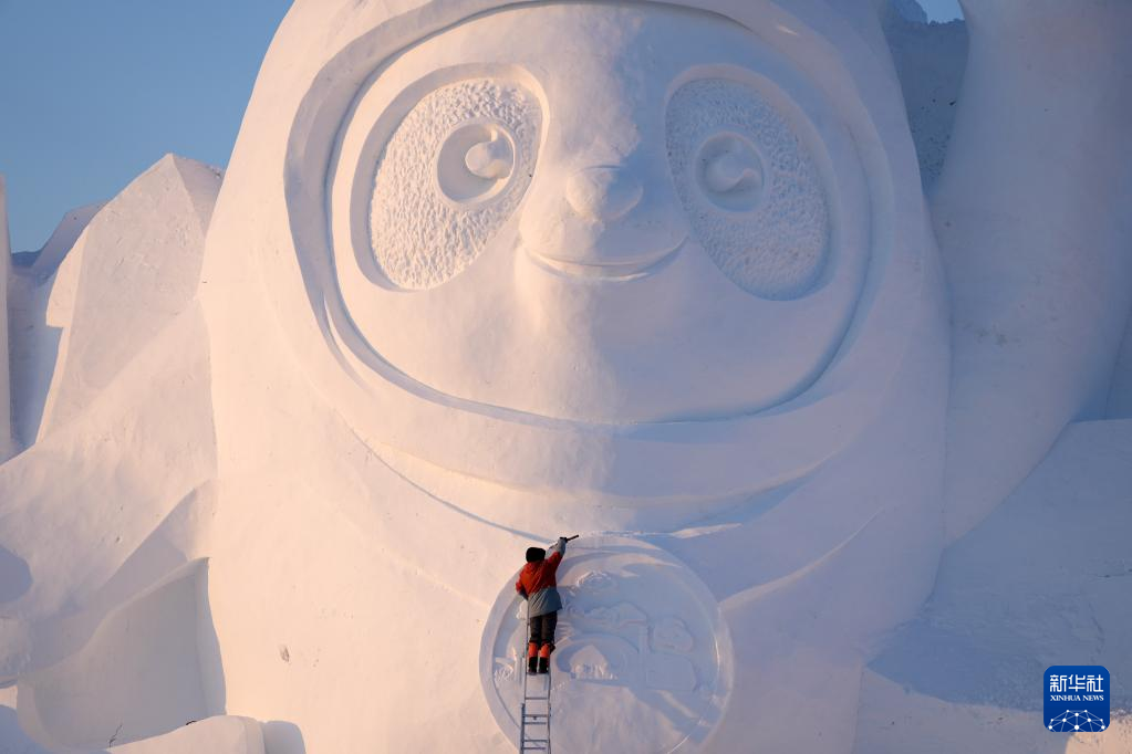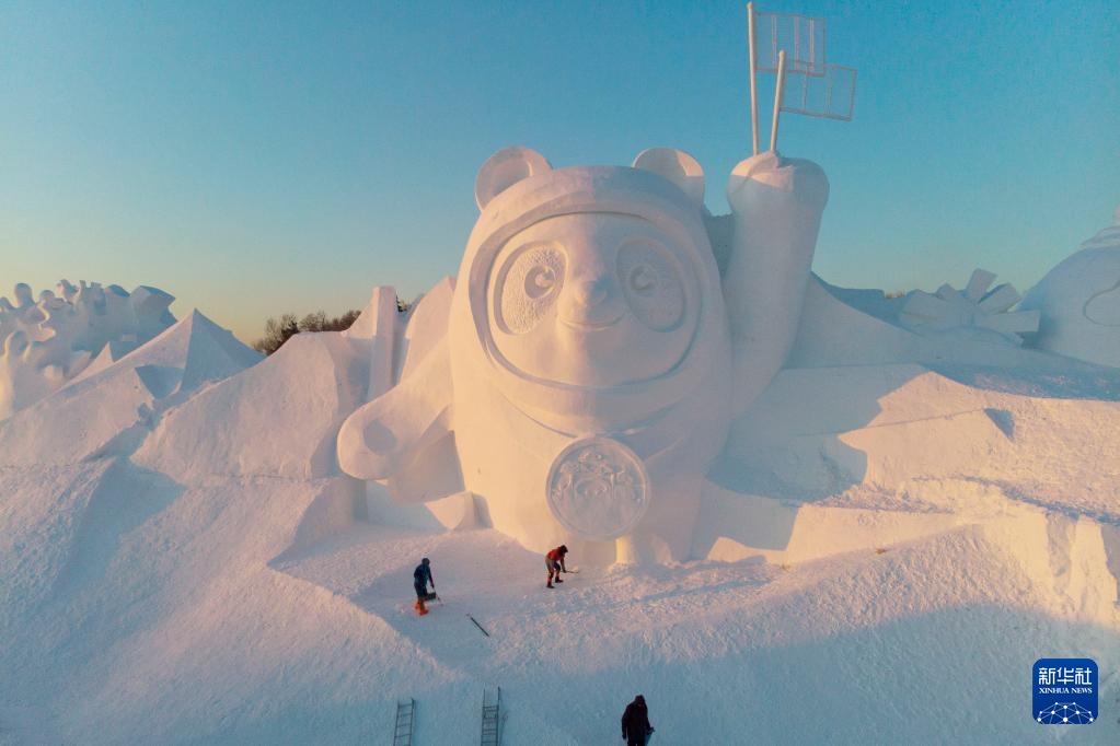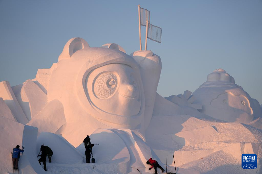 12月28日,在太阳岛雪博会园区,工人对主雪雕“冬奥·太阳岛之旅”进行收尾作业。