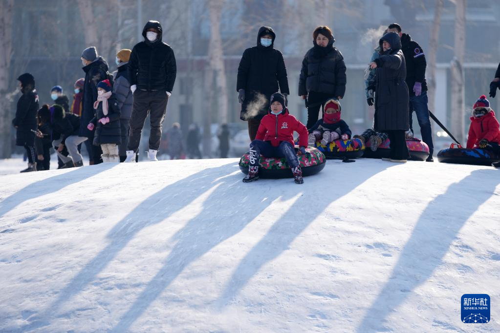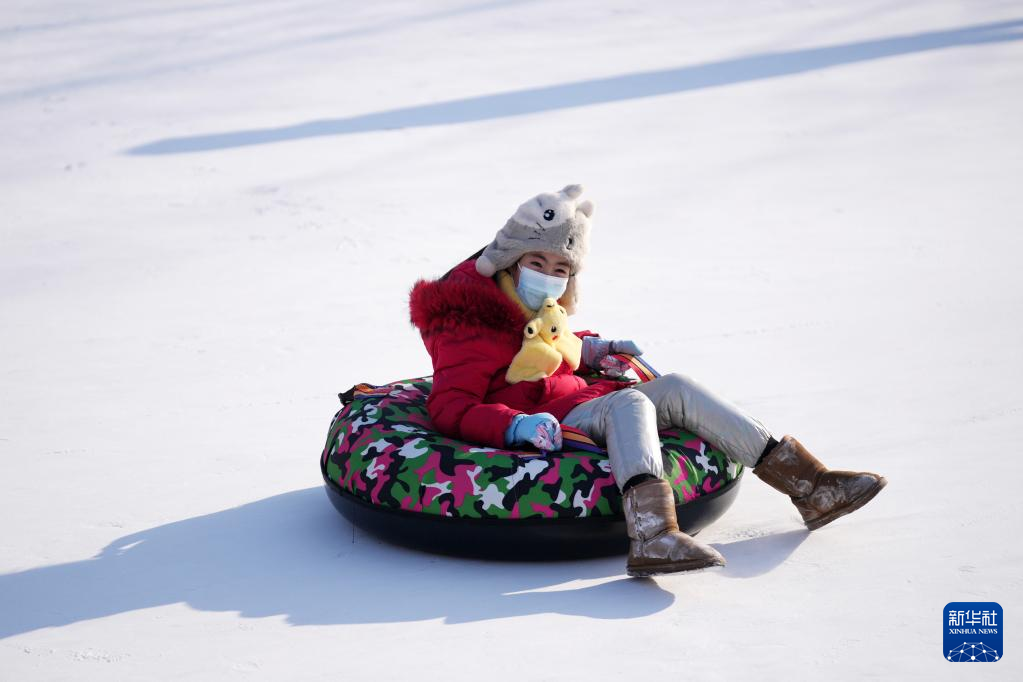 1月3日,在哈尔滨市一白雪覆盖的公园内,市民在玩雪圈。
