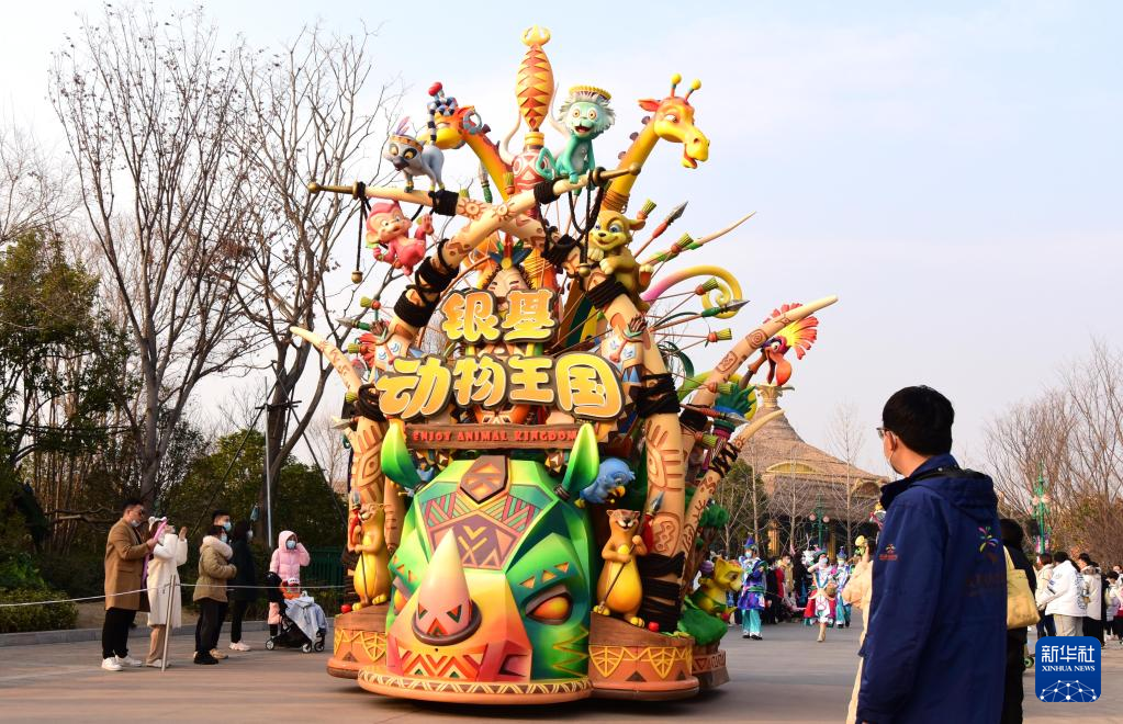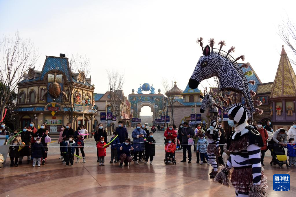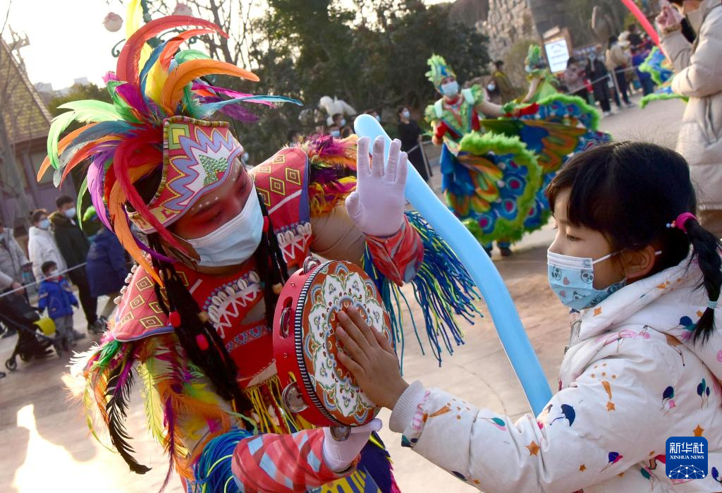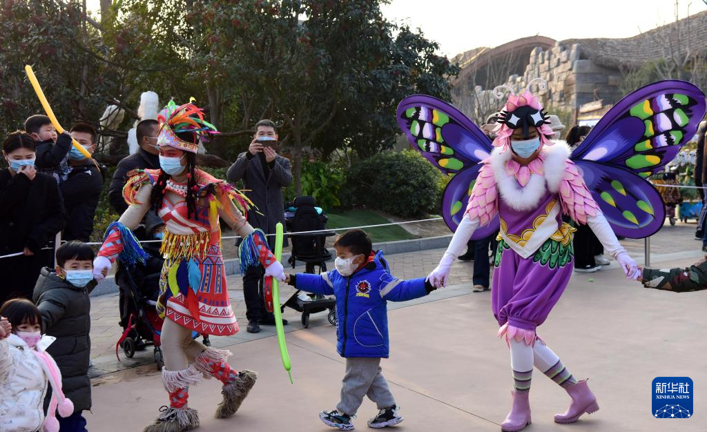 1月2日,小朋友在郑州银基动物王国景区参与游园互动。