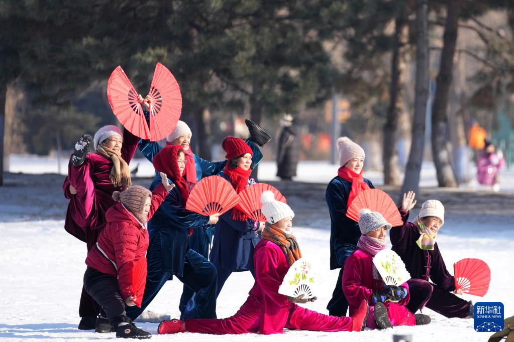 1月3日,在哈尔滨市一白雪覆盖的公园内,市民在雪地上合影。