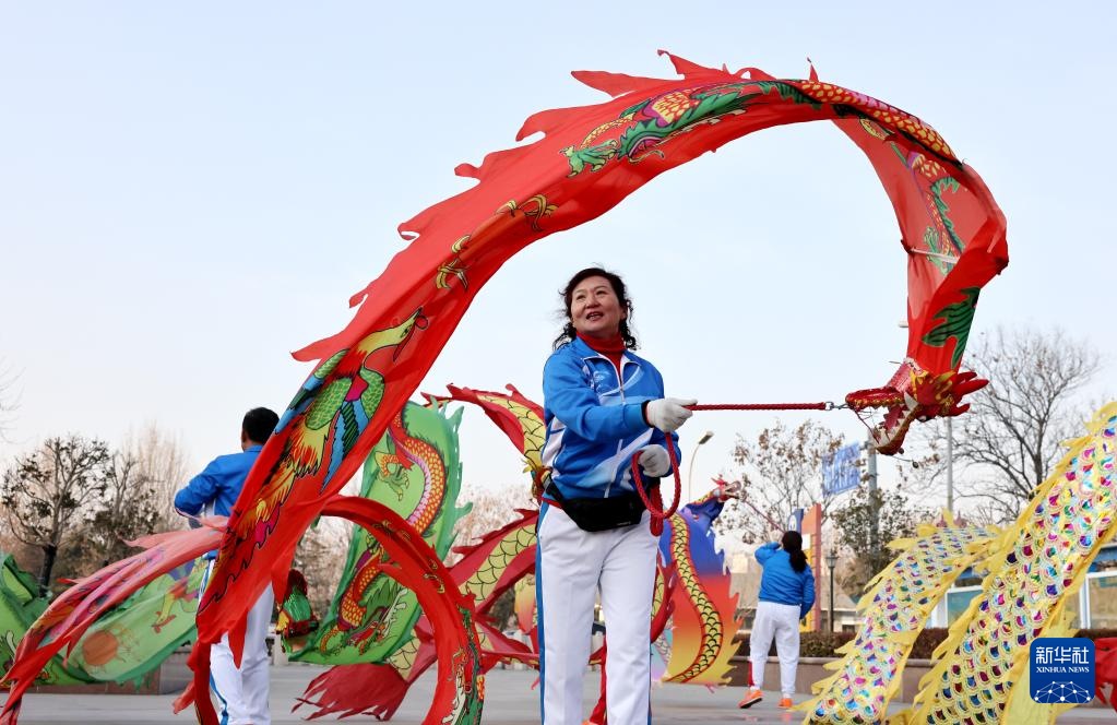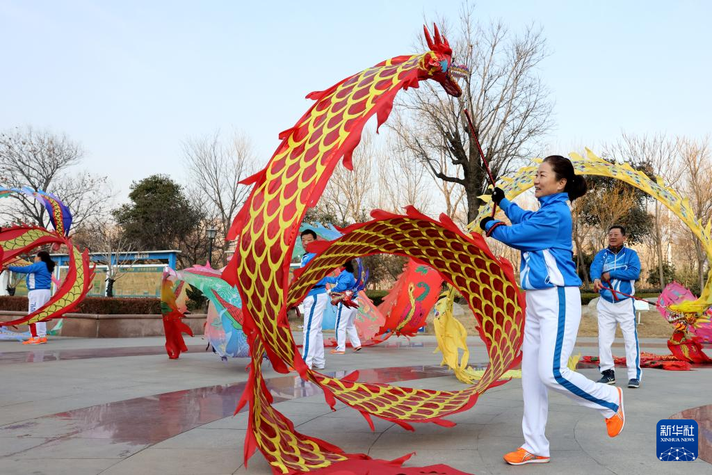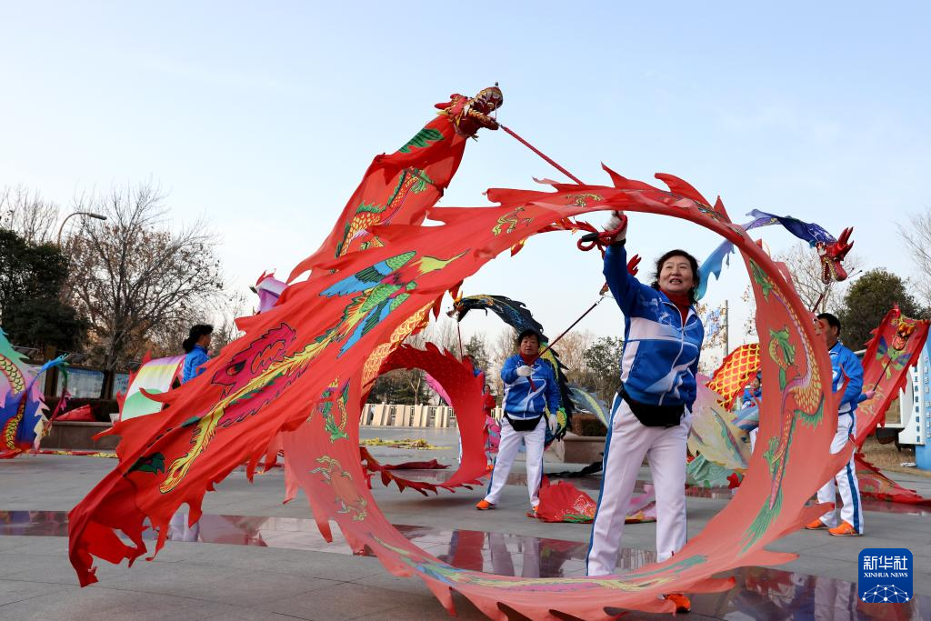 1月1日,山东省枣庄市市民在市中区西沙河公园舞“彩带龙”庆新年。