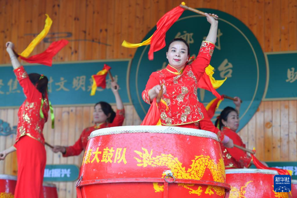 1月1日,湖南省汨罗市瞭家山社区在龙塘大屋乡村大舞台开展迎新年活动,居民表演大鼓。