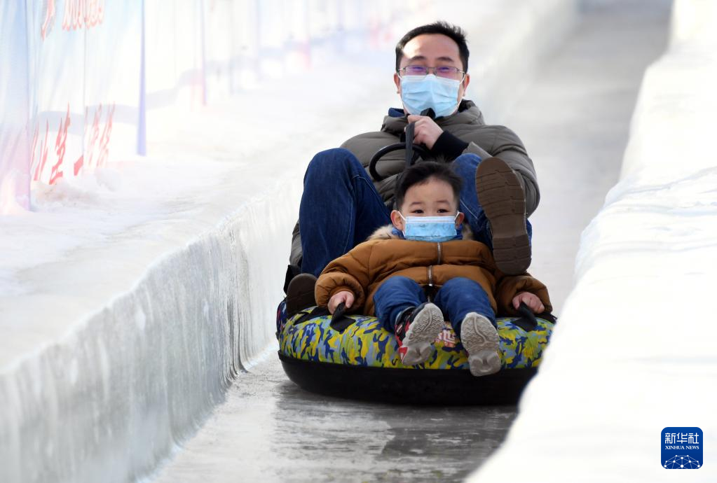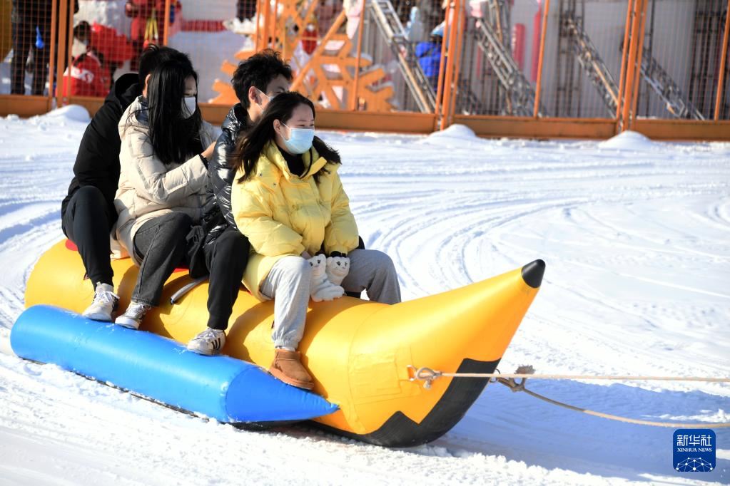 1月1日,游客在第七届北京欢乐水魔方冰雪嘉年华中体验“雪地香蕉船”。