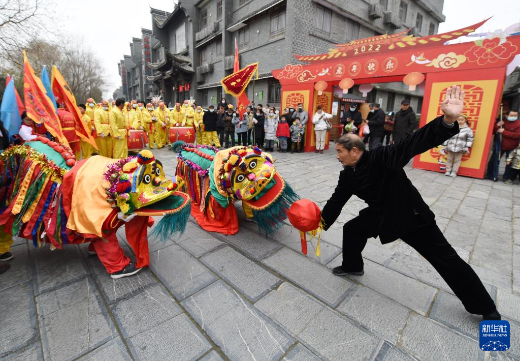 1月1日,民间艺人在安徽省合肥市肥东县长临河镇老街上表演舞狮。