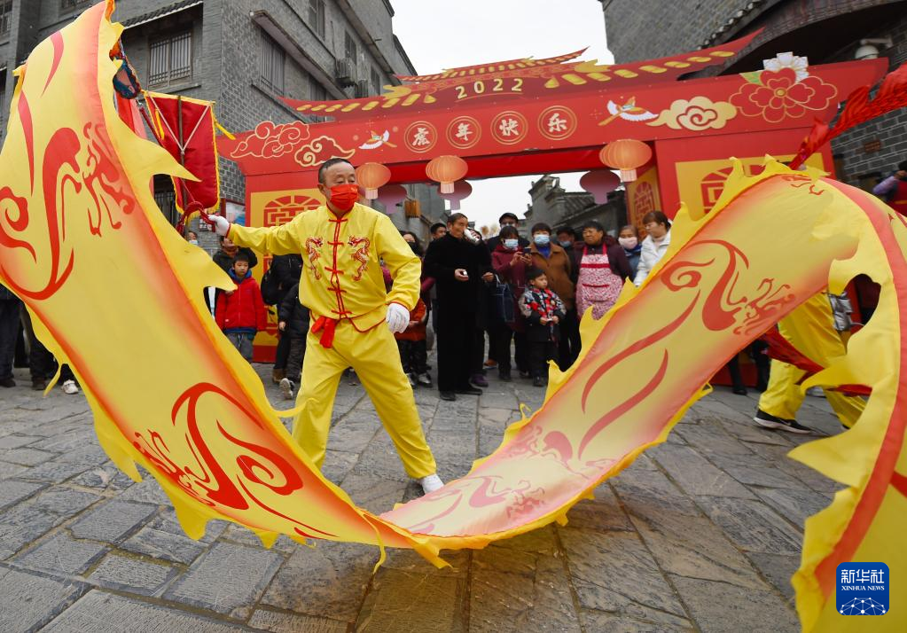 1月1日,民间艺人在安徽省合肥市肥东县长临河镇老街上表演舞龙。