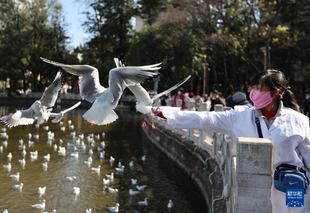 1月1日,人们在云南昆明翠湖公园观赏红嘴鸥。