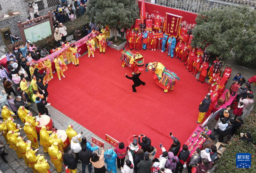 1月1日,民间艺人在安徽省合肥市肥东县长临河镇老街上表演舞狮(无人机照片)。