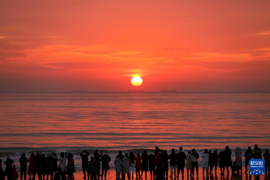1月1日,在山东日照万平口风景区,参加元旦迎日祈福活动的市民和游客在观看日出。