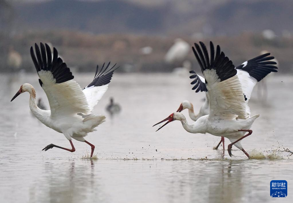 新年伊始,在位于鄱阳湖畔的南昌高新区鲤鱼洲管理处五星白鹤保护小区里,来此越冬的国家一级保护鸟类白鹤展翅起舞,姿态万千。