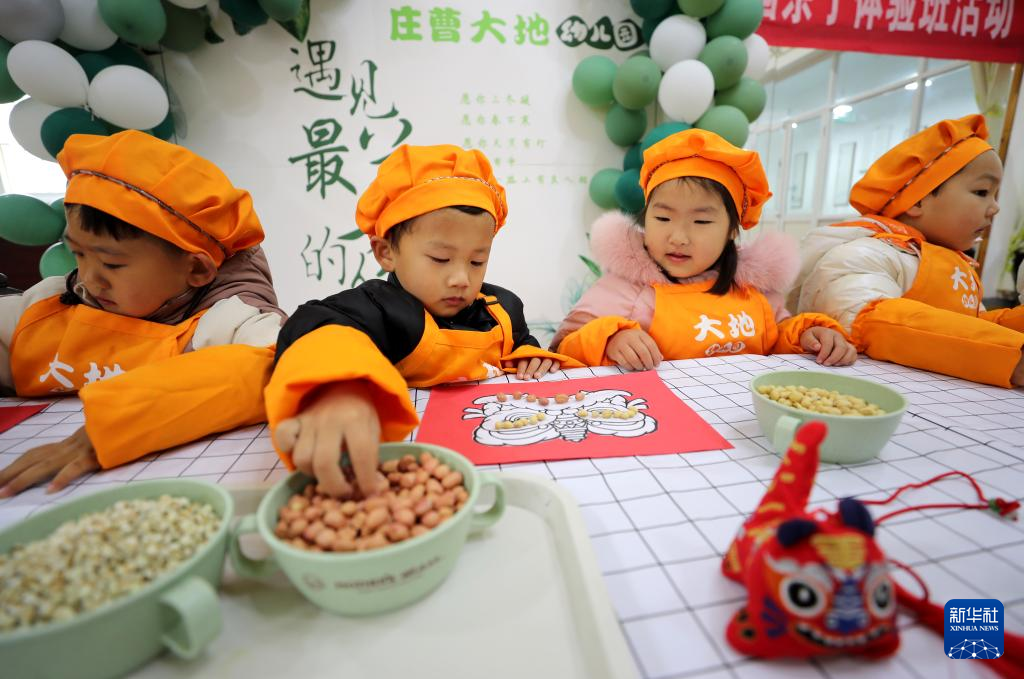 1月10日,安徽省全椒县一幼儿园的孩子们通过制作五谷粘贴画,辨识腊八粥食材。