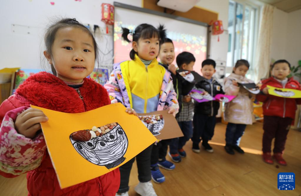1月10日,安徽省合肥市蜀山区一幼儿园的小朋友展示用食材和纸板制作的“腊八粥”。