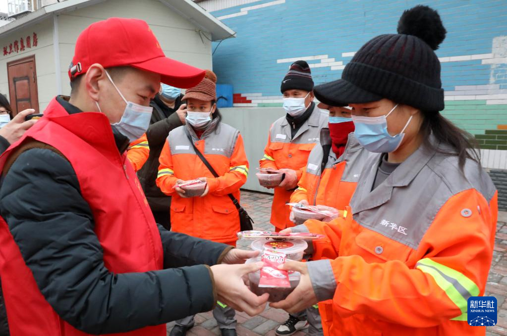1月10日,石家庄市新华区宁安街道志愿者将腊八粥送给环卫工人。