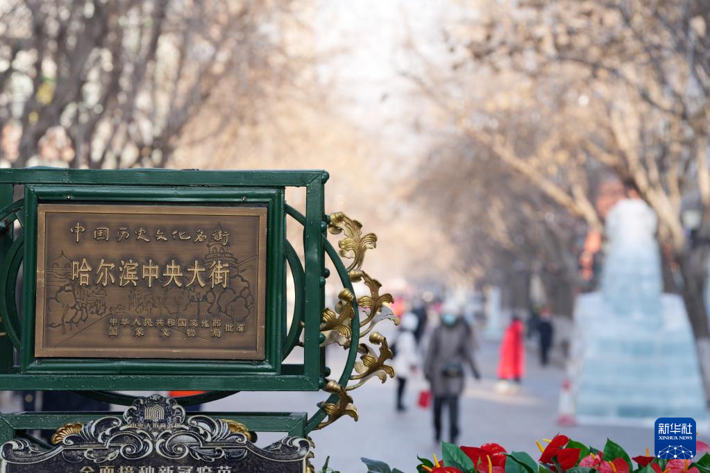 1月1日,人们在哈尔滨市中央大街上游览。