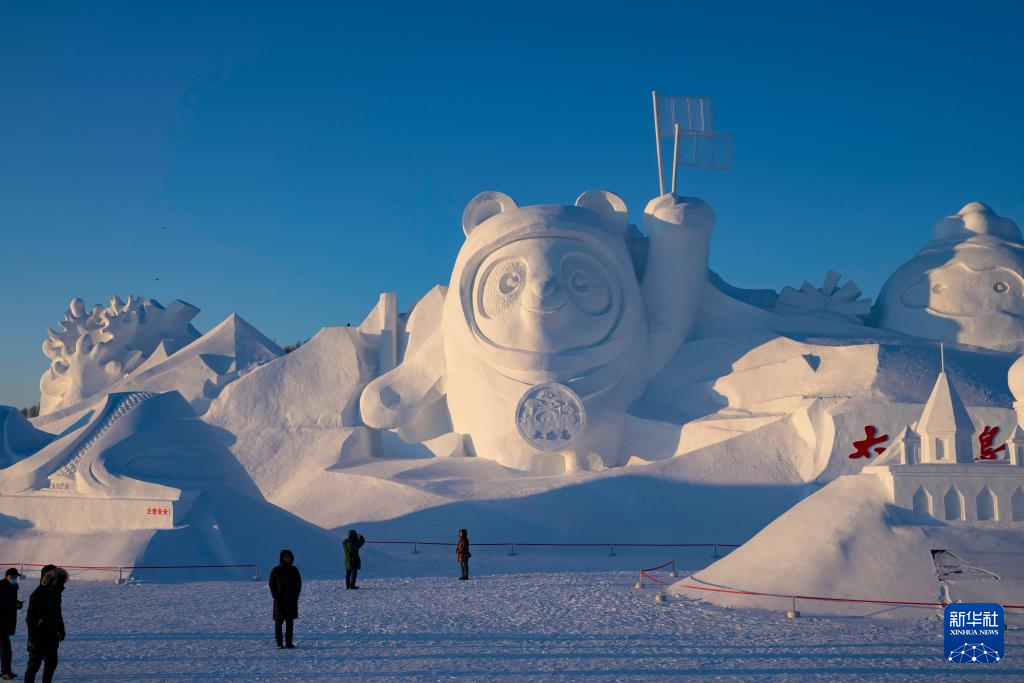 1月2日,在太阳岛雪博会园区,游客在雪雕前游览。