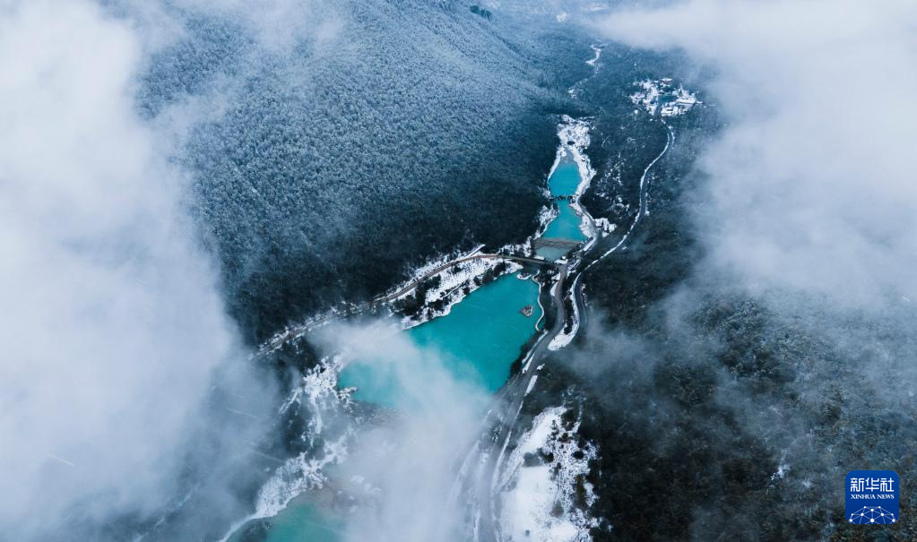 1月13日拍摄的蓝月谷(无人机照片)。蓝月谷风景区位于云南省丽江市玉龙雪山东麓,冬日山谷间云雾弥漫,白雪点缀,别样美丽。