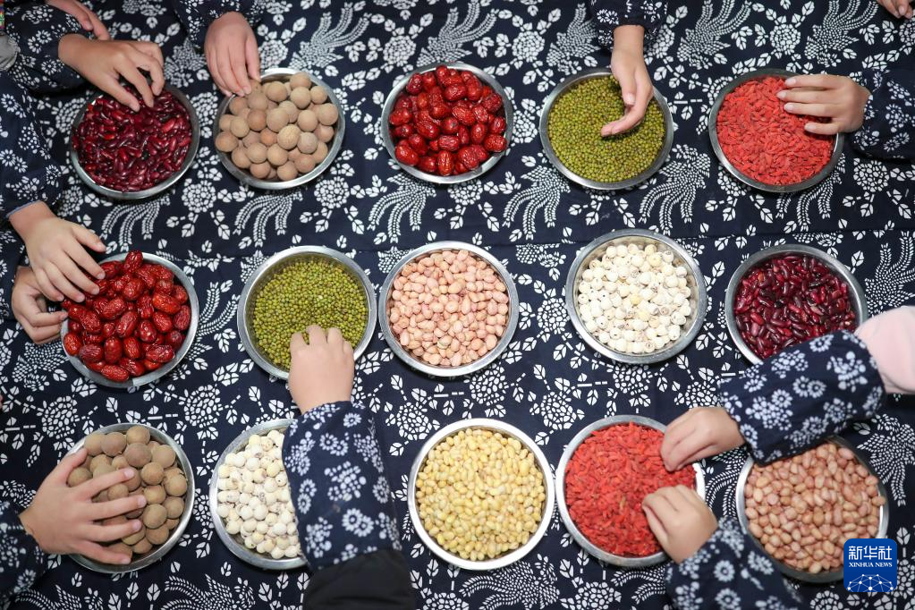 1月10日,贵州省铜仁市玉屏侗族自治县一幼儿园的小朋友在辨识熬制腊八粥的食材。当日是农历腊月初八,是中国传统的“腊八节”。