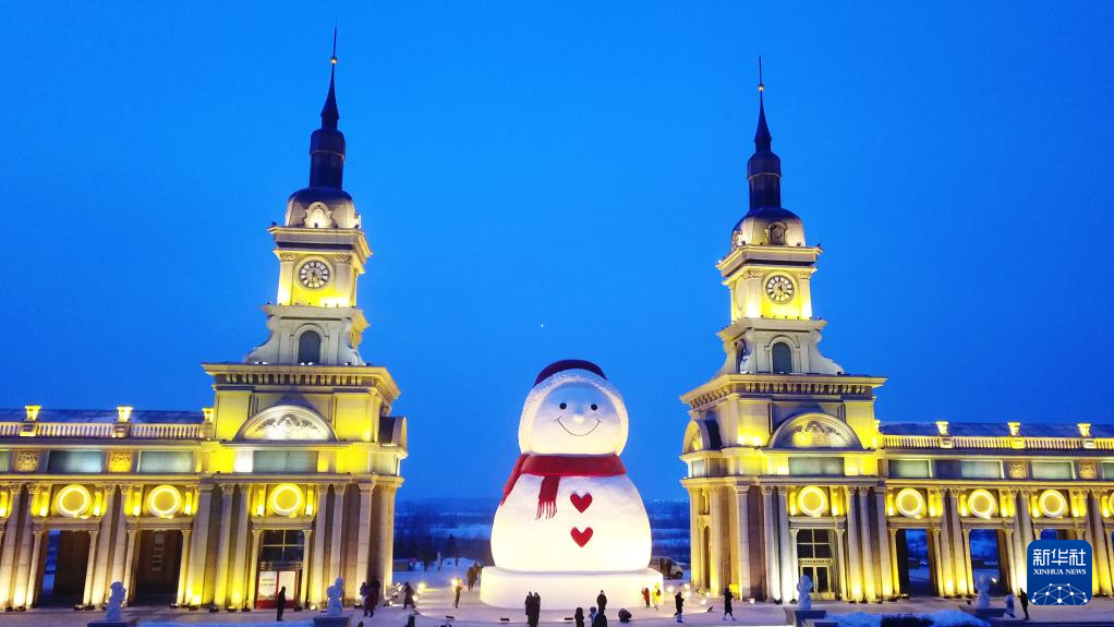 这是1月9日拍摄的哈尔滨松花江畔的巨型雪人(无人机照片)。这个巨型雪人高约18米,宽约13米,用雪量2000余立方米。