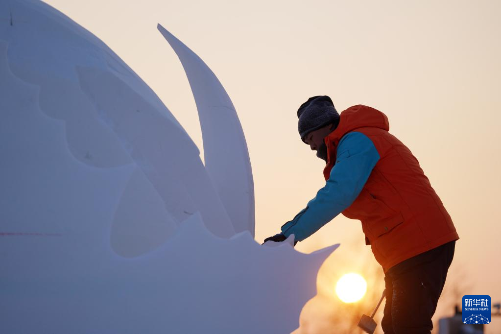 1月12日,在哈尔滨太阳岛雪博会园区的雪雕比赛现场,雪雕师在创作中。