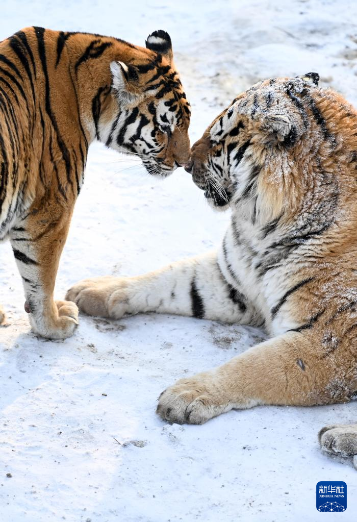 1月13日,在吉林省东北虎园内,两只东北虎在雪地上嬉戏。