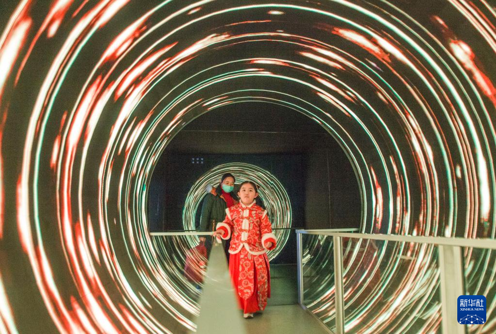 2月3日,一名孩子在南京科技馆通过“眩光通道”。
