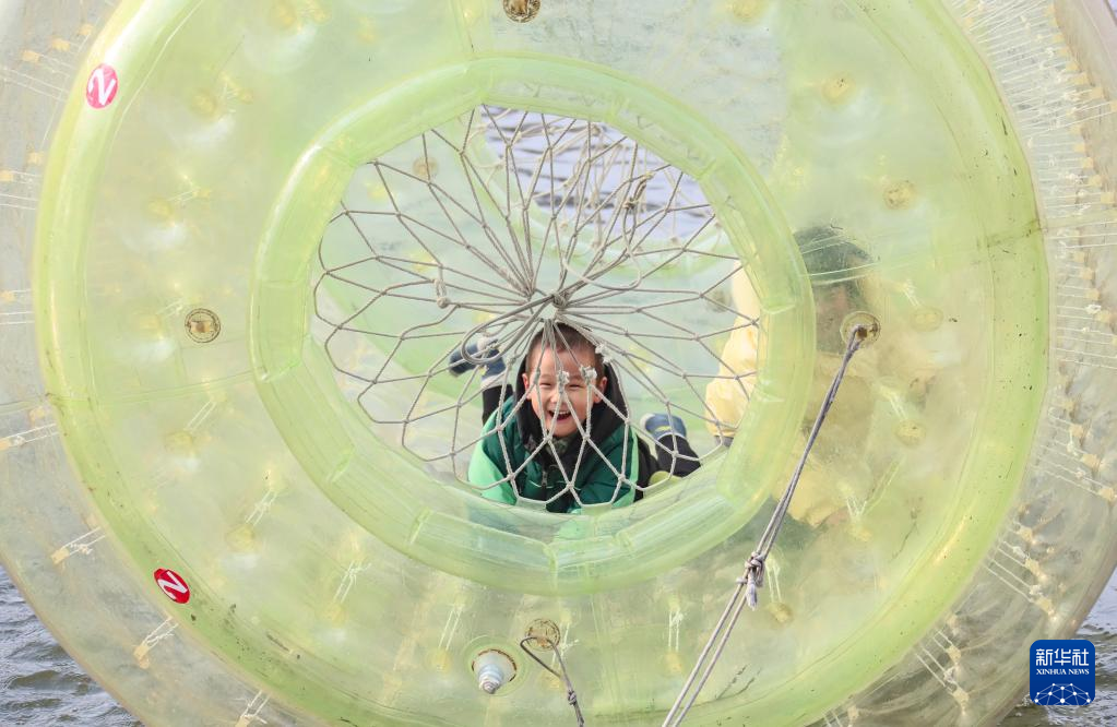 2月3日,一名小朋友在江苏淮安楚秀园玩水上气球。