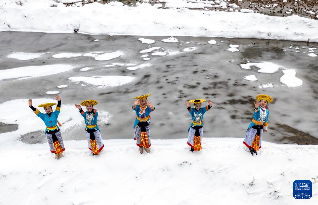 2月3日,游客身着民族服饰在湖南省邵阳市隆回县虎形山瑶族乡大花瑶景区游玩(无人机照片)。