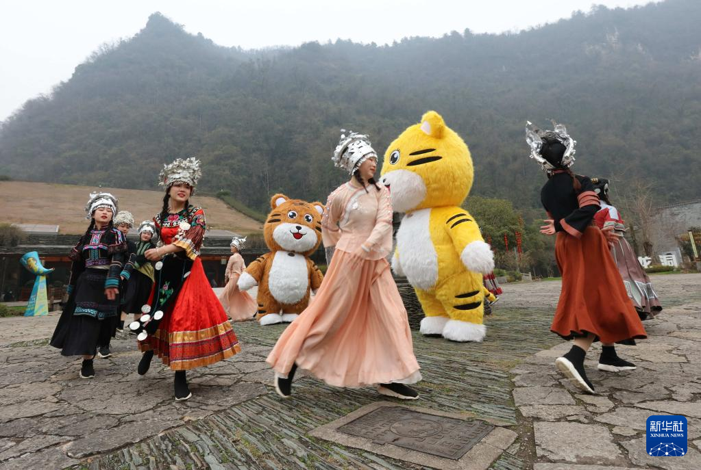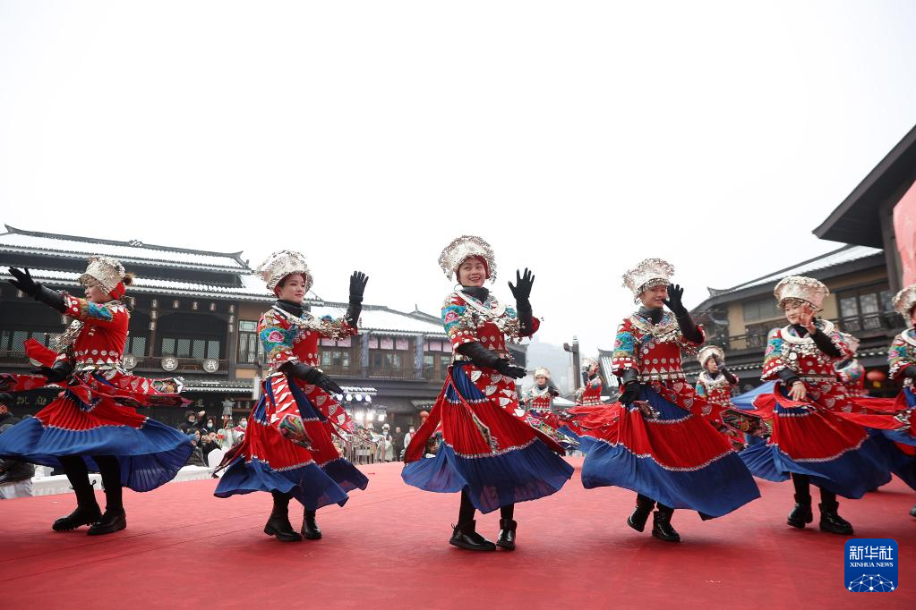 2月1日,苗族同胞在贵州省丹寨县万达小镇景区为游客表演苗族踩鼓舞。