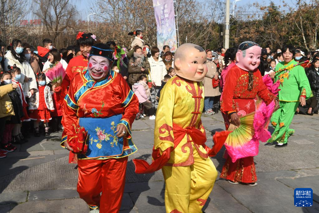 2月1日,在安徽省阜阳生态乐园牌楼广场上,民间艺人进行民俗表演。