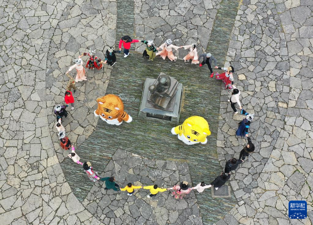 2月1日,湖南省张家界市武陵源区黄龙洞景区工作人员跳起欢快的摆手舞。