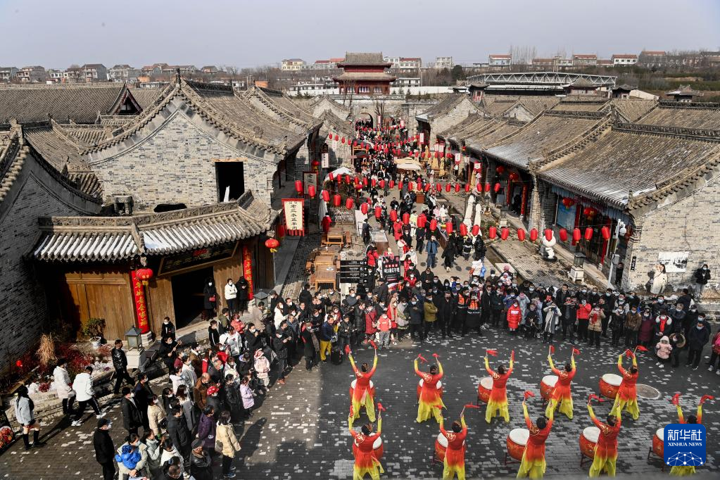 2月1日,锣鼓队在陕西西安白鹿原影视城为观众表演。