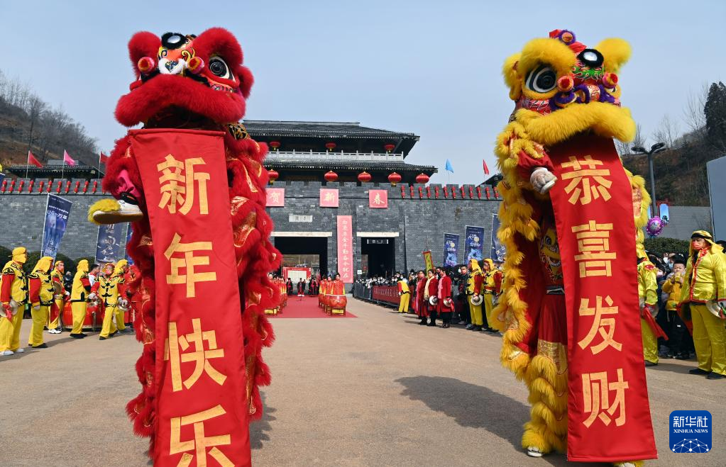 2月1日,在陕西西安白鹿原影视城内,具有关中特色的锣鼓狮子在为观众表演。