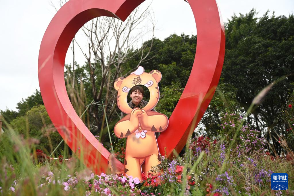 2月1日,游客在福州左海公园内一处“虎”元素装饰景观留影。