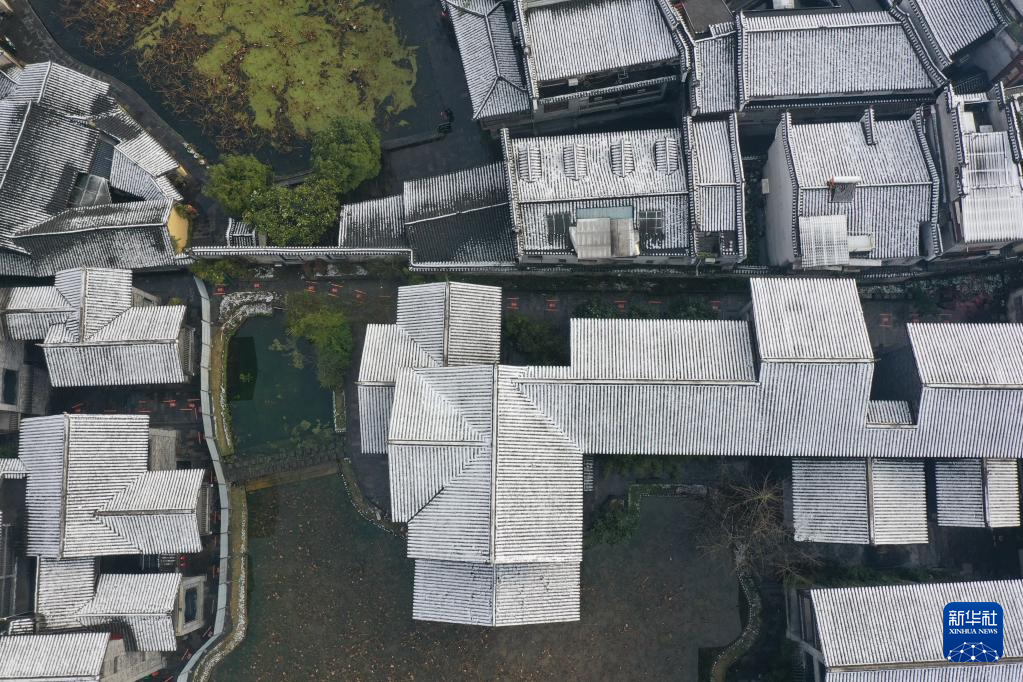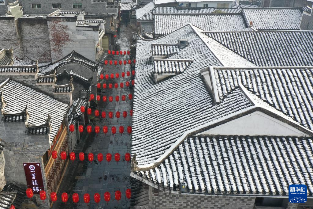 2月9日在湖南省湘西土家族苗族自治州吉首市拍摄的乾州古城雪景(无人机照片)。