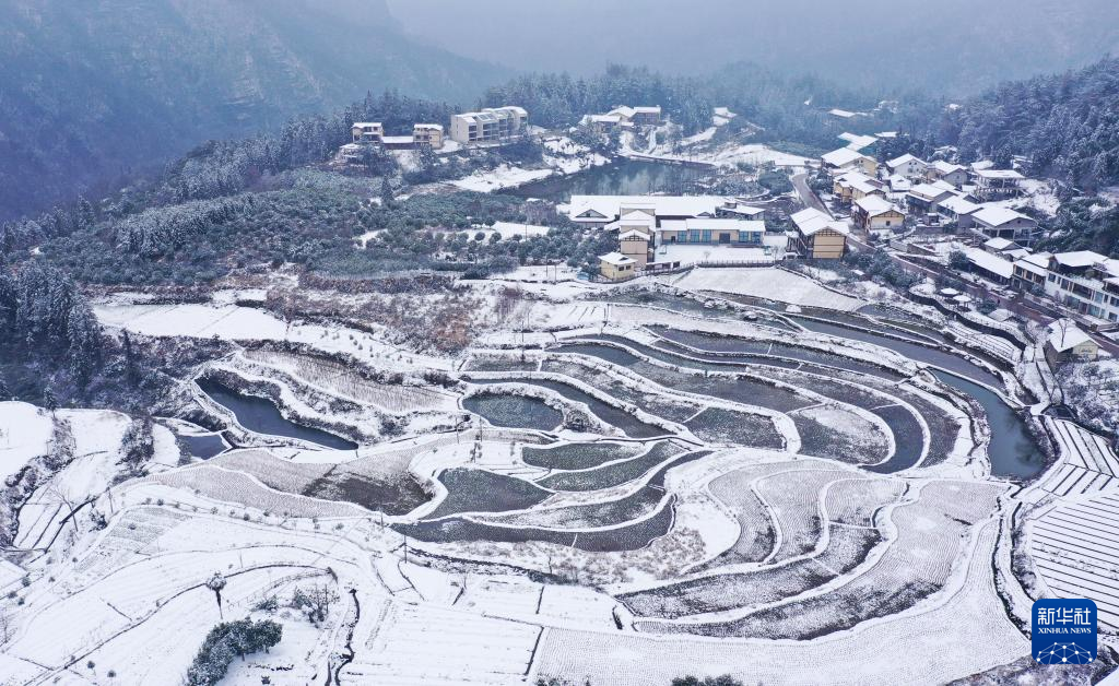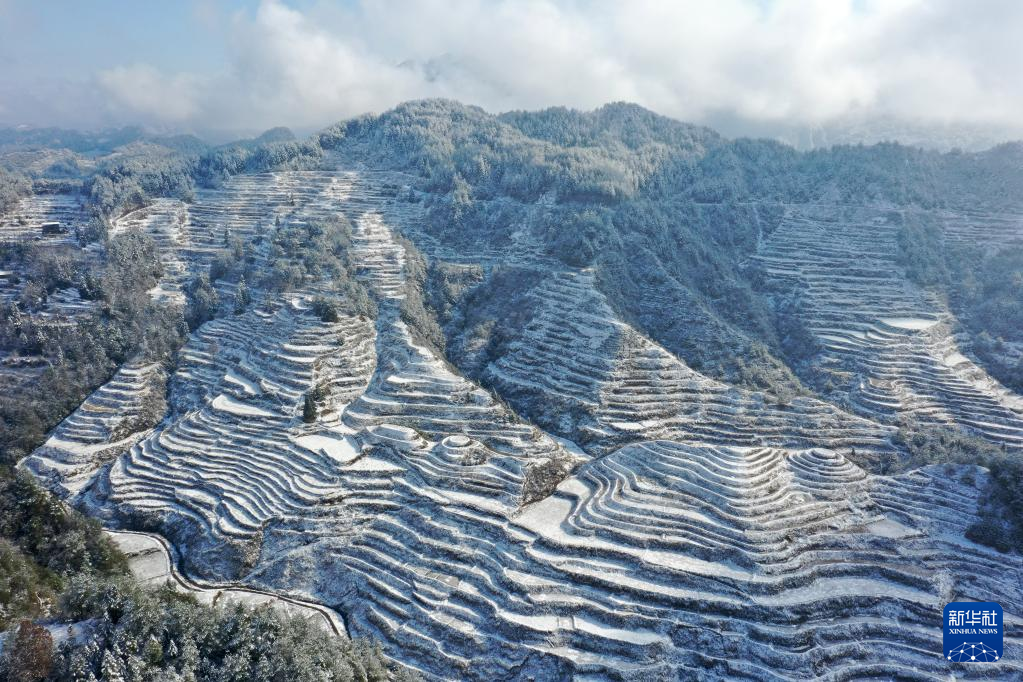 2月9日在重庆市酉阳土家族苗族自治县花田乡何家岩村拍摄的梯田雪景(无人机照片)。