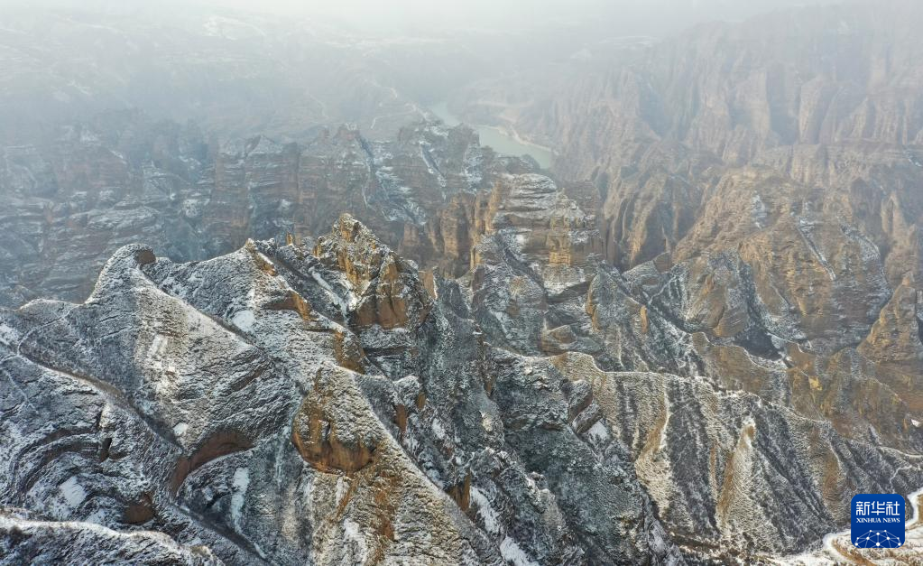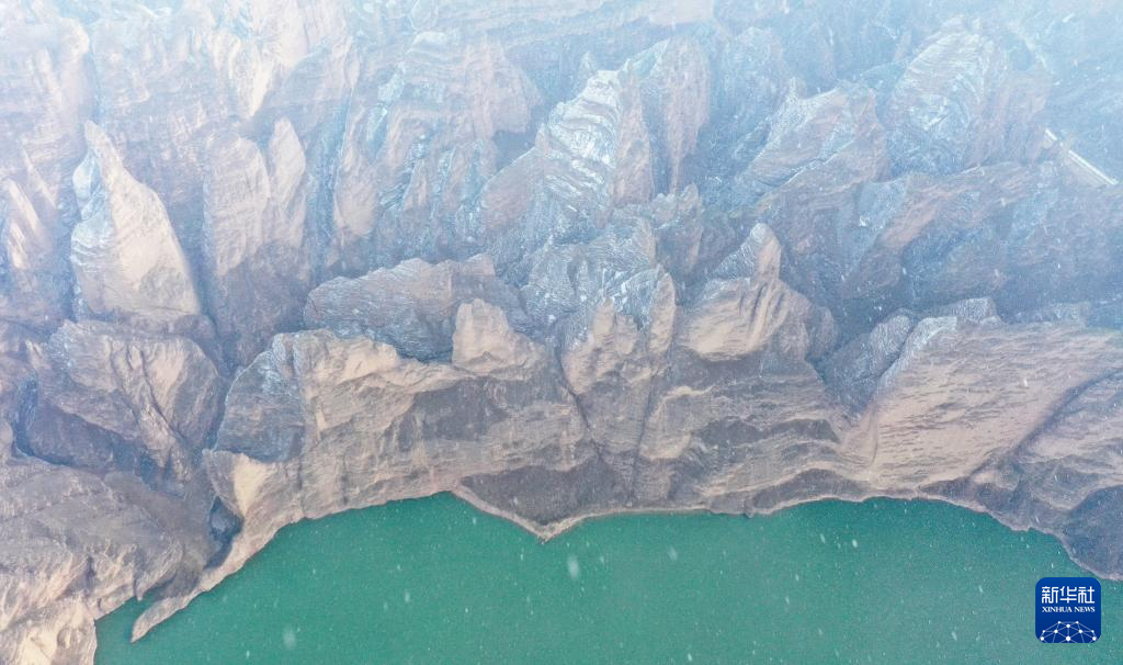 雪后的甘肃炳灵丹霞国家地质公园(2月18日摄,无人机照片)。