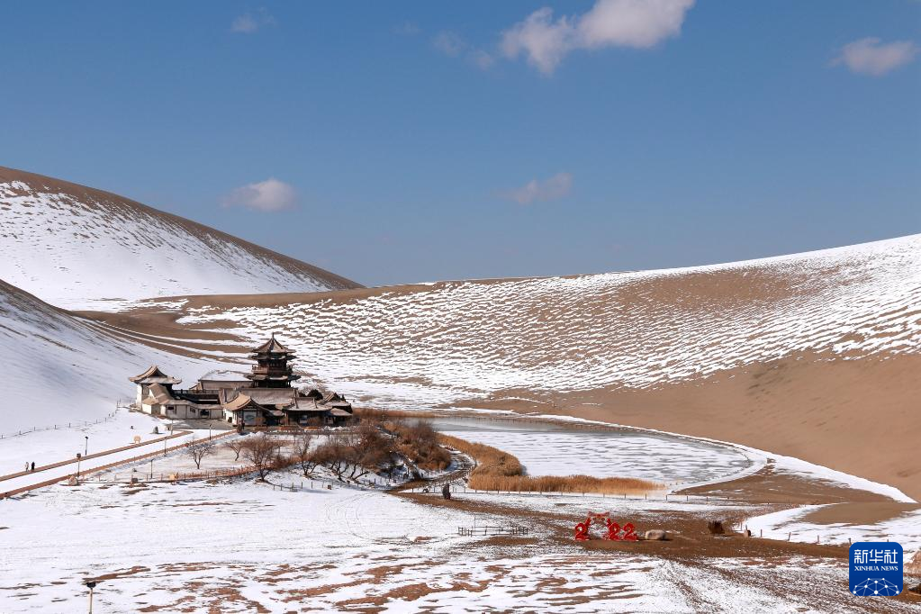 这是2月18日拍摄的甘肃省敦煌市鸣沙山月牙泉景区雪景。