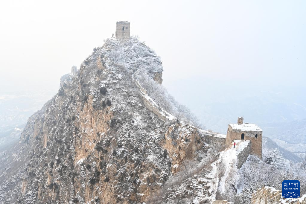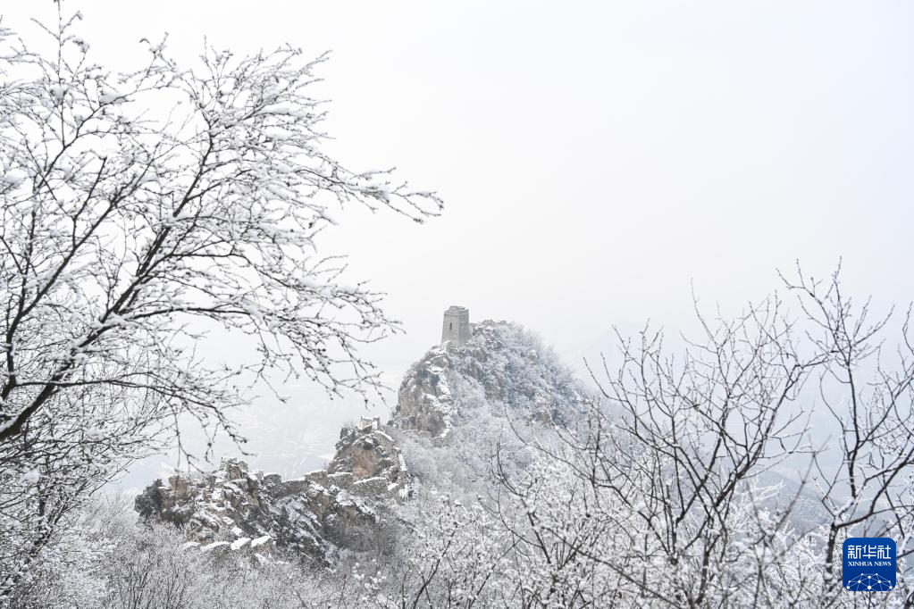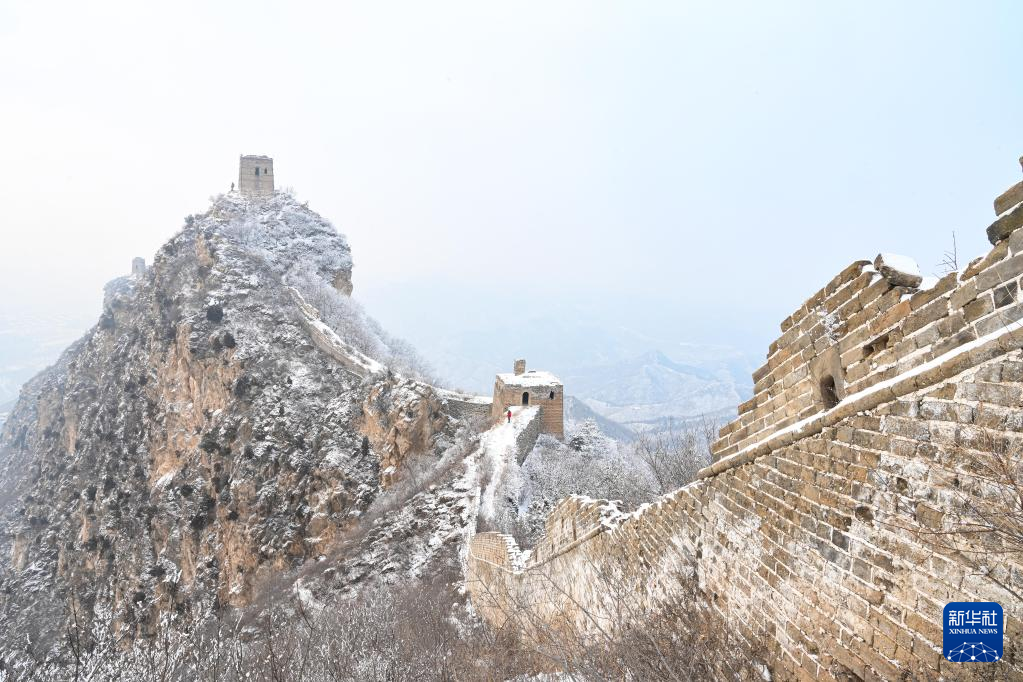 近日,北京迎来降雪天气。位于北京市密云区和河北省滦平县交界处附近的长城望京楼、仙女楼等段长城,在白雪的映衬下更加雄奇壮观。