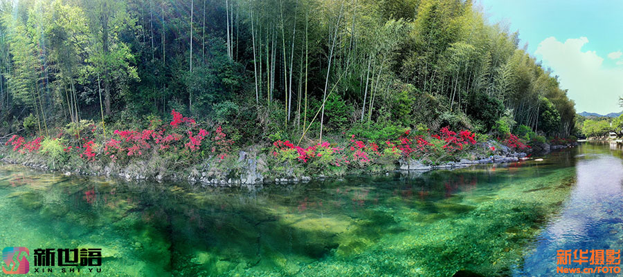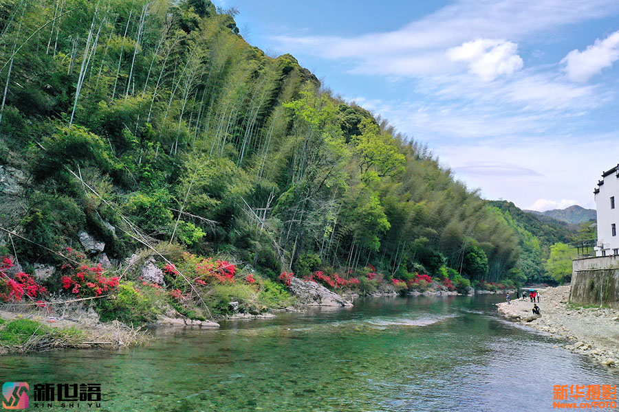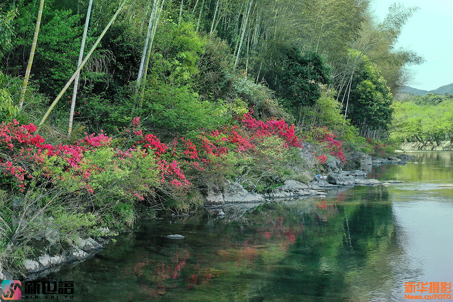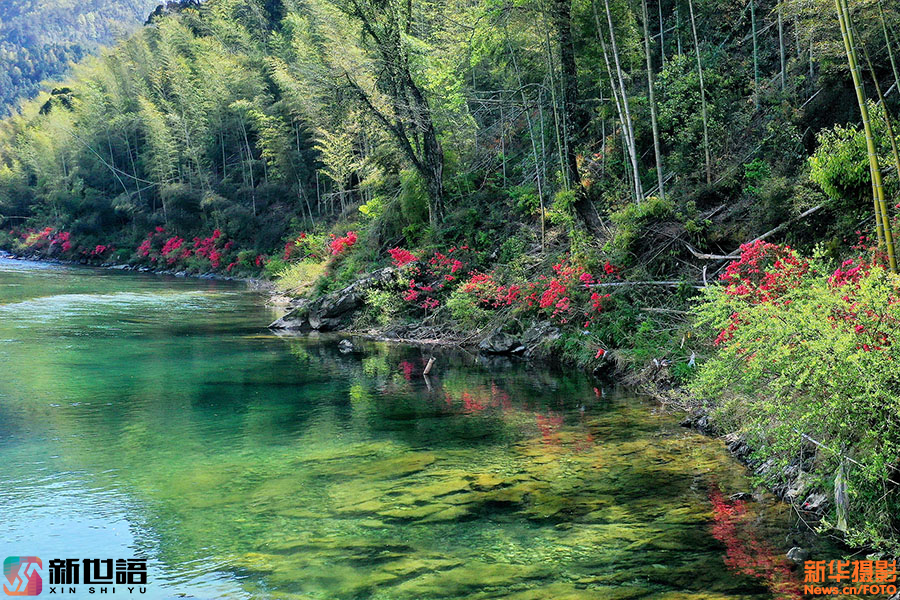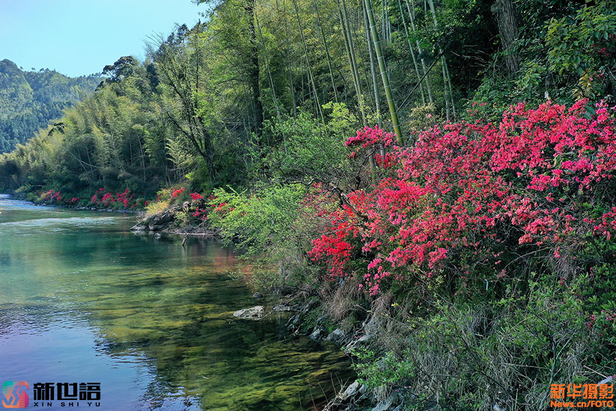 近日,位于新安江源头的休宁县鹤城乡大源河沿岸的野生杜鹃花盛开,一簇簇、一片片沿着河岸逶迤绵延十余里,与青山碧水交相辉映,美不胜收。新世语/徐明(声明:凡带有水印的图片,系版权图片,受法律保护,未经许可请勿转载。)pagebreak