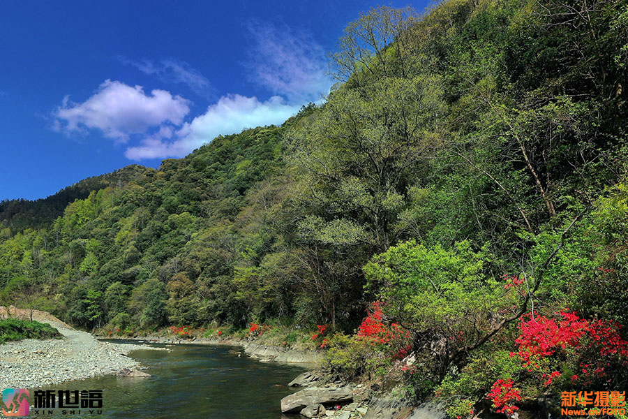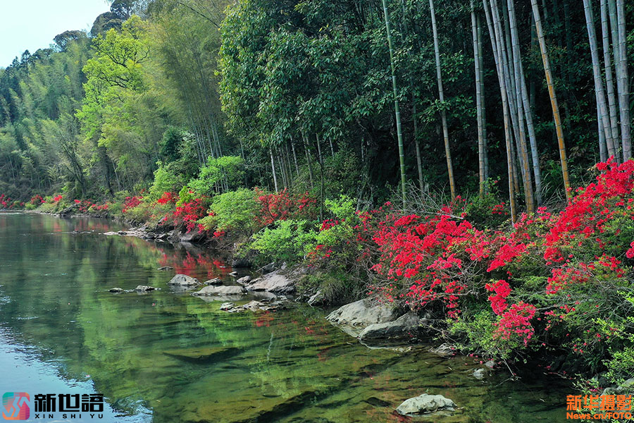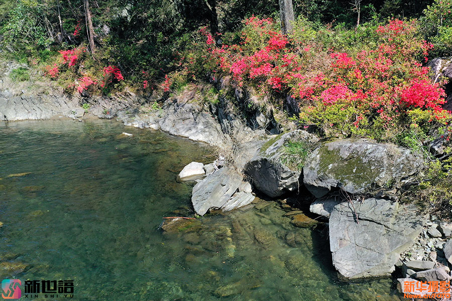 近日,位于新安江源头的休宁县鹤城乡大源河沿岸的野生杜鹃花盛开,一簇簇、一片片沿着河岸逶迤绵延十余里,与青山碧水交相辉映,美不胜收。新世语/徐明(声明:凡带有水印的图片,系版权图片,受法律保护,未经许可请勿转载。)