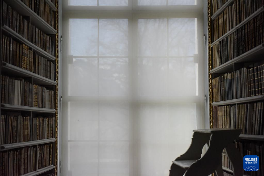 这是4月13日拍摄的奥地利阿德蒙特修道院图书馆大厅一角。