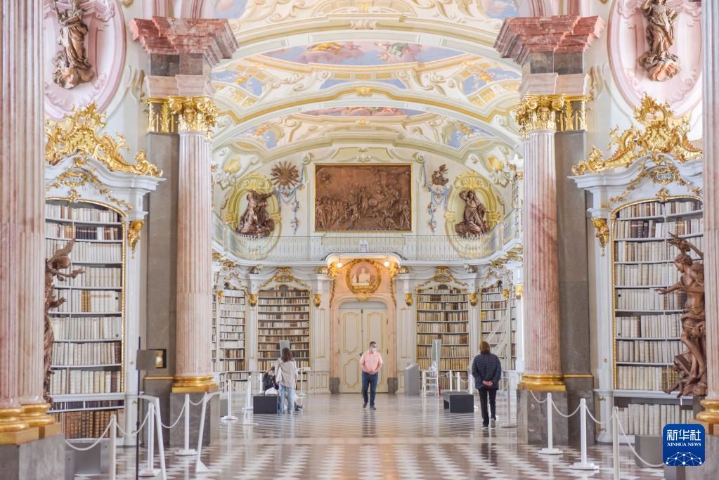 这是4月13日拍摄的奥地利阿德蒙特修道院图书馆大厅。