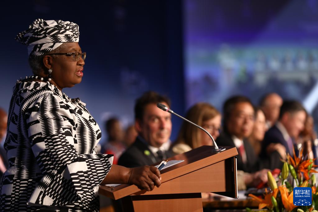 6月12日,世界贸易组织总干事伊维拉(前)在瑞士日内瓦举行的世贸组织第12届部长级会议开幕式上致辞。