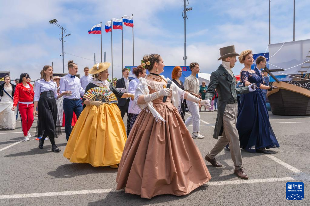 6月12日,在俄罗斯符拉迪沃斯托克市中心广场,人们身着传统服饰参加舞蹈表演。