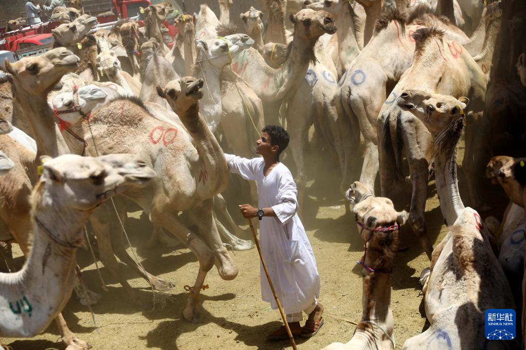 6月10日,商贩在埃及开罗附近的一处骆驼市场等待顾客。