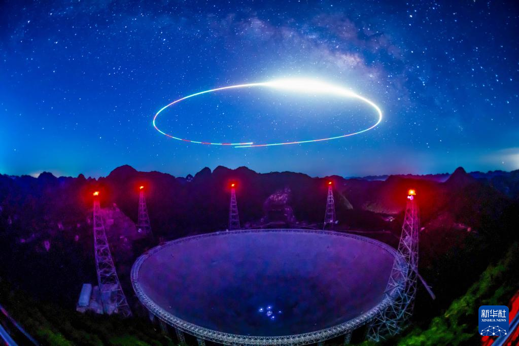 7月24日拍摄的“中国天眼”夜景(维护保养期间拍摄,无人机光绘)。繁星之下,被誉为“中国天眼”的500米口径球面射电望远镜呈现出别样的美丽。