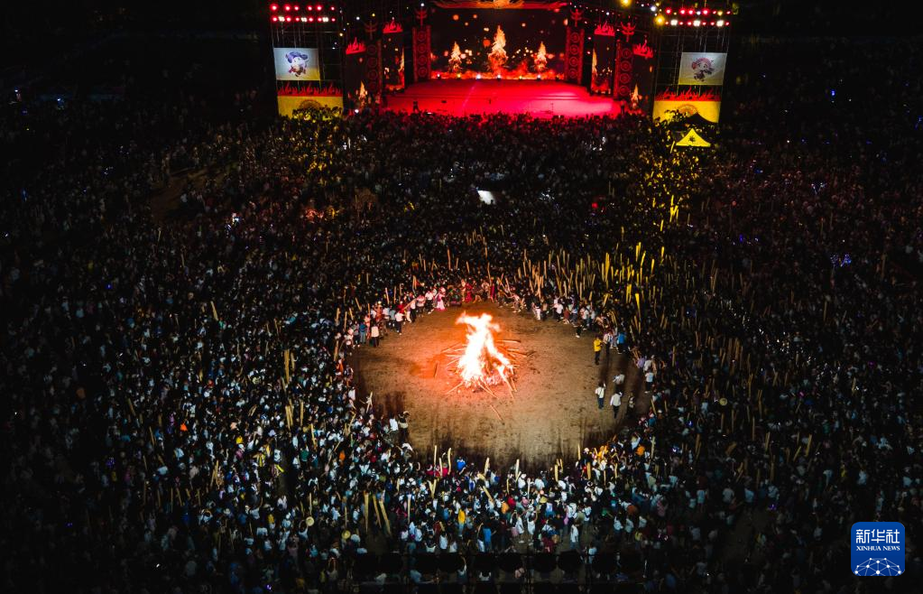 7月22日,群众在云南省石林彝族自治县石林民族体育馆欢庆火把节(无人机照片)。