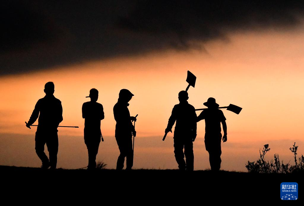 7月26日,治沙人员在地处毛乌素沙漠腹地的内蒙古自治区鄂尔多斯市鄂托克前旗百万亩柠条种植项目区行走。