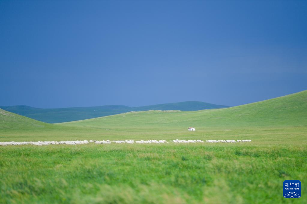 夏日,内蒙古锡林郭勒草原一碧千里,牛羊散落其中,河流蜿蜒曲折,景色宜人。