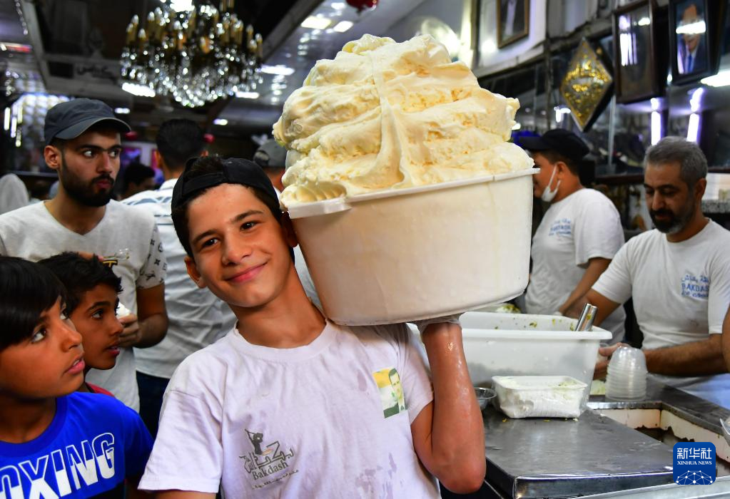 8月8日,在叙利亚大马士革的一家冰激凌店,男孩端着一桶阿拉伯冰激凌。