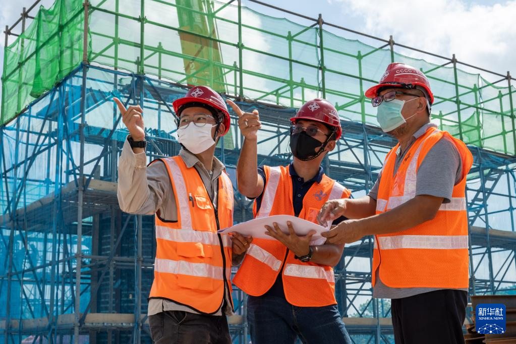 7月25日,西亚赫明(中)在位于马来西亚彭亨州的马东铁项目六分部施工现场工作。